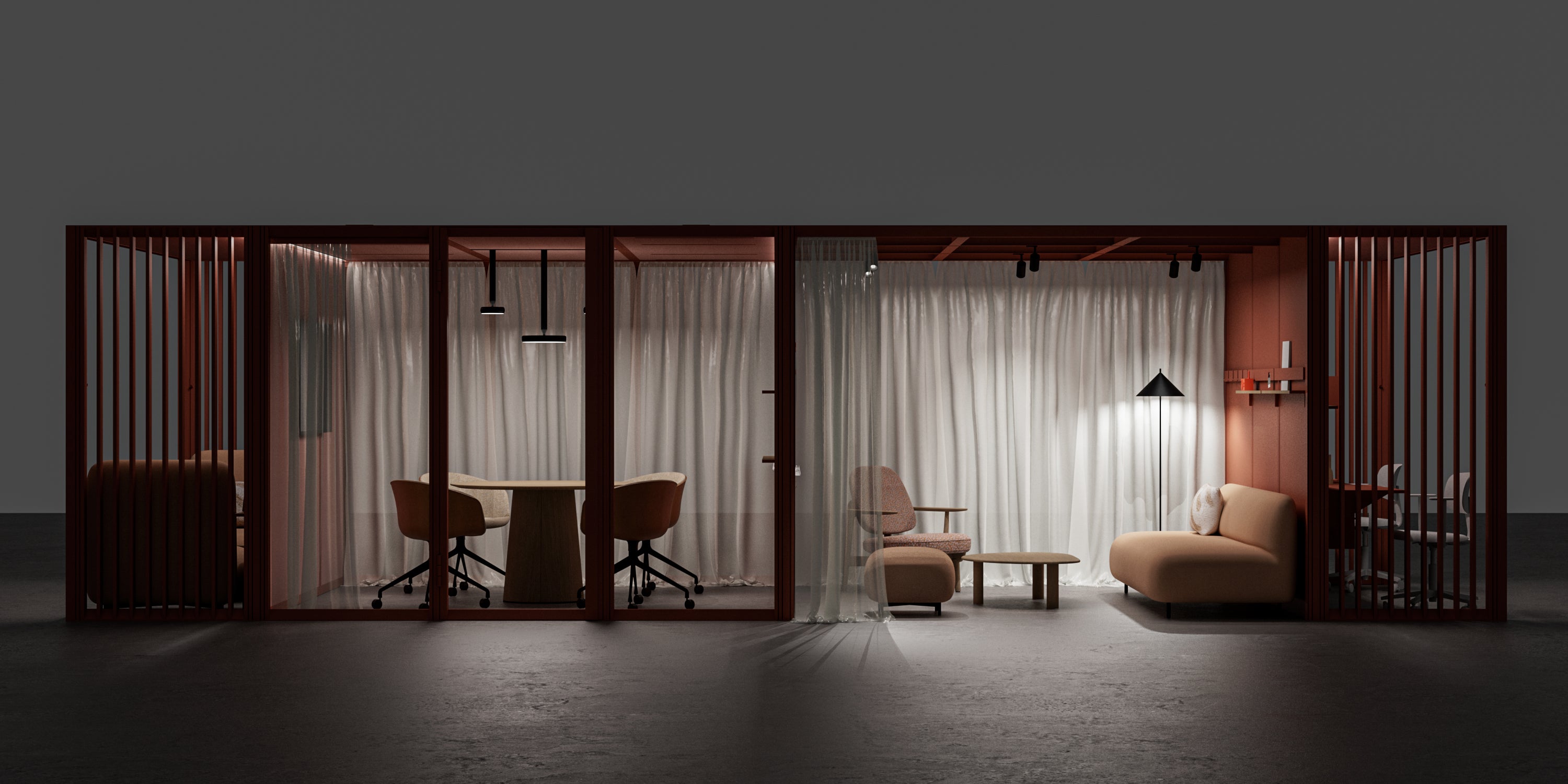 Rom-i-rom-konseptet handler om å dele et større rom i mindre definerte soner uten å gjøre permanente endringer i bygget. Det gjør det mulig å lage separate rom for ulike formål innenfor samme rom. For eksempel kan en stor kontorplass deles inn i mindre arbeidsstasjoner eller møterom. Løsningene er fleksible og tilpasningsdyktige for raskt å møte endrede behov eller ønsker.