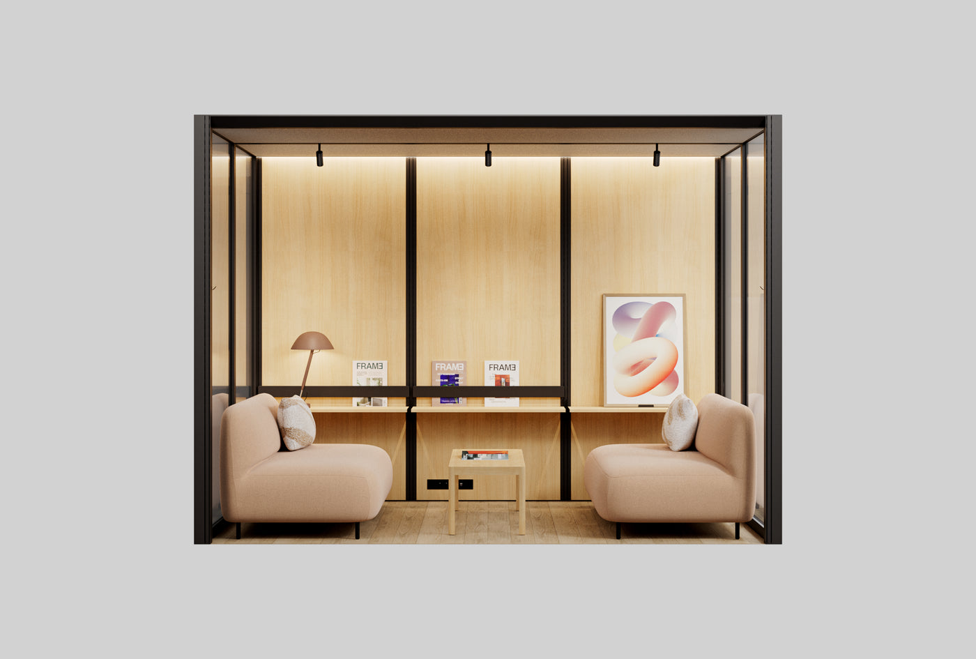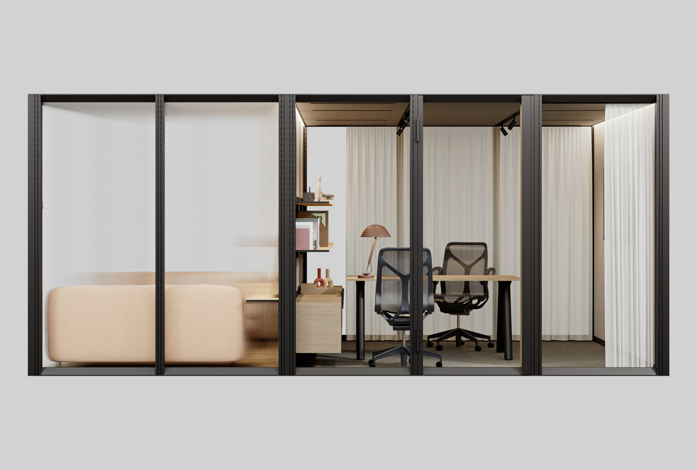 - Telefonkiosker og stillerom: Dette er små, isolerte rom eller båser plassert i et større miljø for konsentrert arbeid, samtaler eller møter. De kan være laget av materialer som tre, glassfiber eller metall og kan utstyres med lydabsorberende materiale for å minimere lydoverføring.